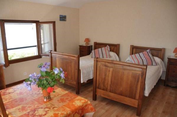 - Upstairs room: 22.50 m² south and west facing, 2 windows: 2 beds of 90 x 190, with two pillows per person and a pillow, blankets, closet, dresser and tables, sink, floor lino way parquet.